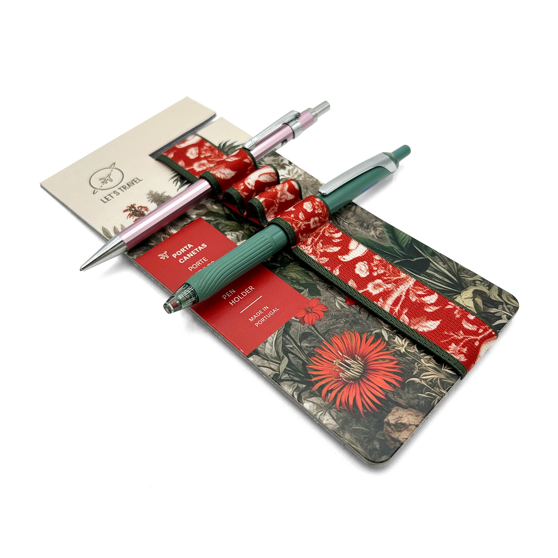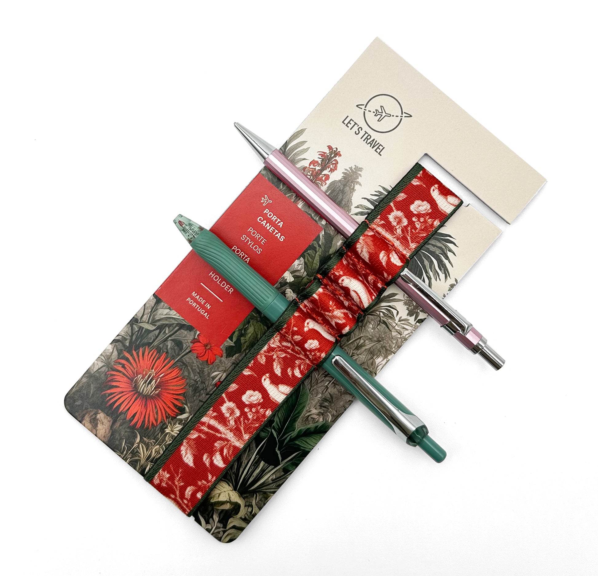 Com capacidade para até 4 canetas ou lápis, ajusta-se facilmente à capa de um caderno ou agenda A5, mantendo tudo à mão com praticidade e um toque de elegância. O padrão inspirado na natureza, com tons suaves, cria uma harmonia visual serena e orgânica com os restantes produtos da coleção.
