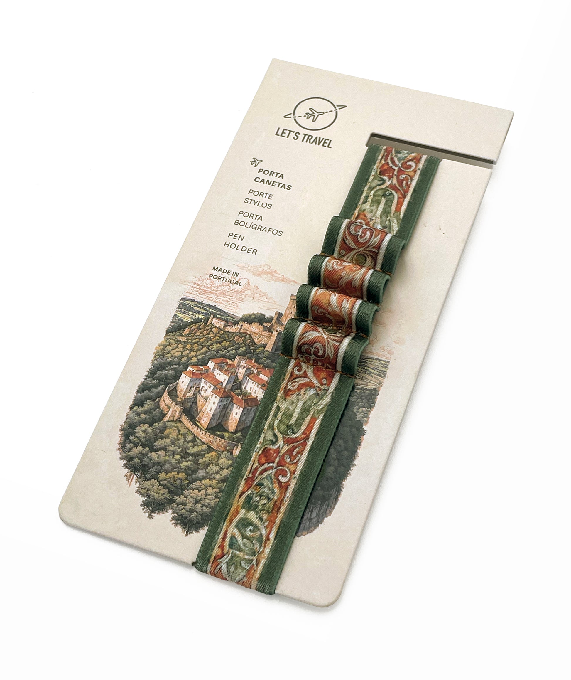 Com capacidade para até 4 canetas ou lápis, ajusta-se facilmente à capa de um caderno ou agenda A5, mantendo tudo à mão, com elegância e funcionalidade. O padrão discreto, mas sofisticado, segue a paleta de cores da coleção — verde, bege e terracota — criando uma harmonia visual com os restantes produtos.