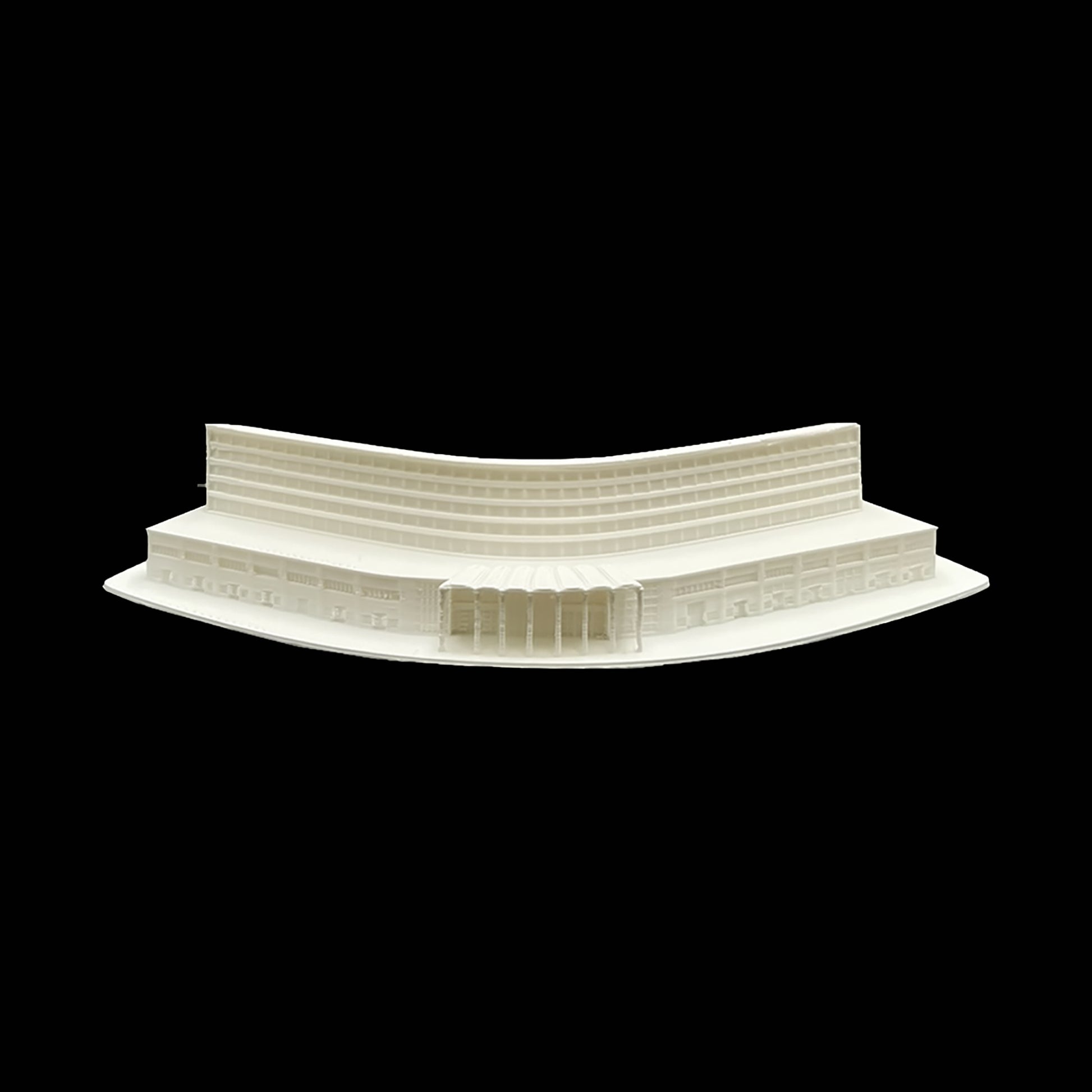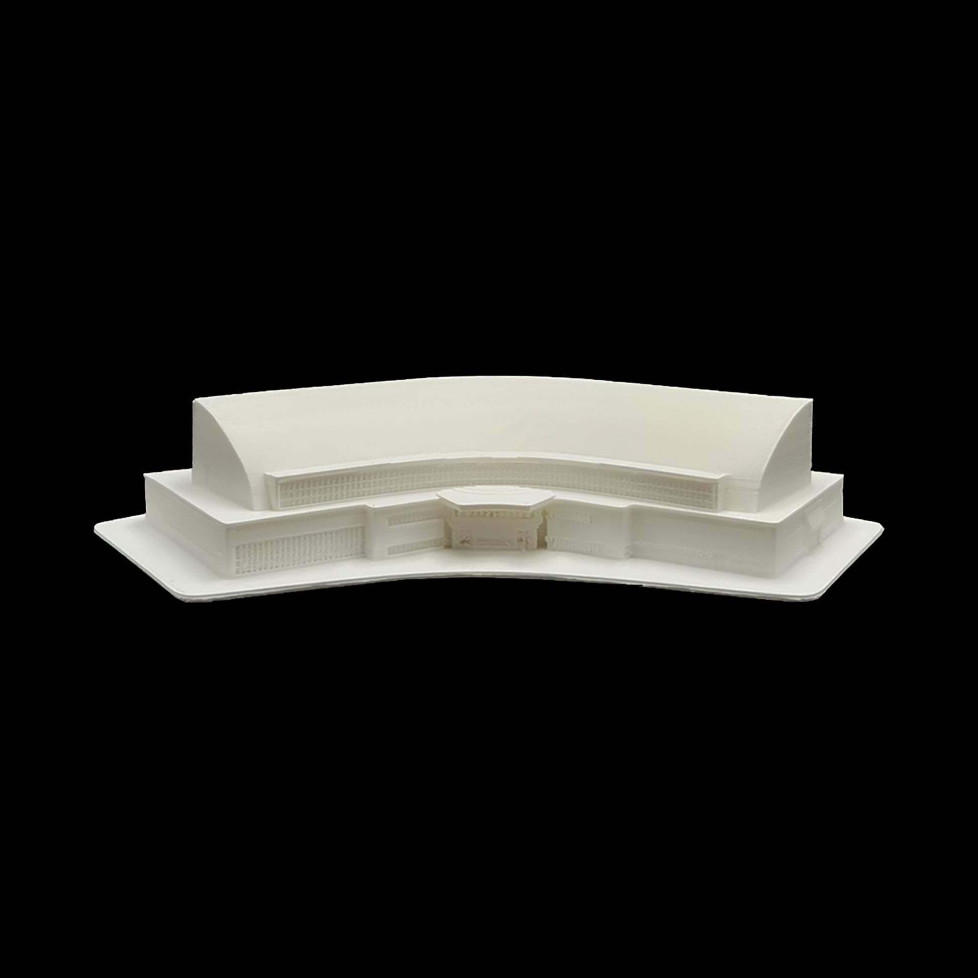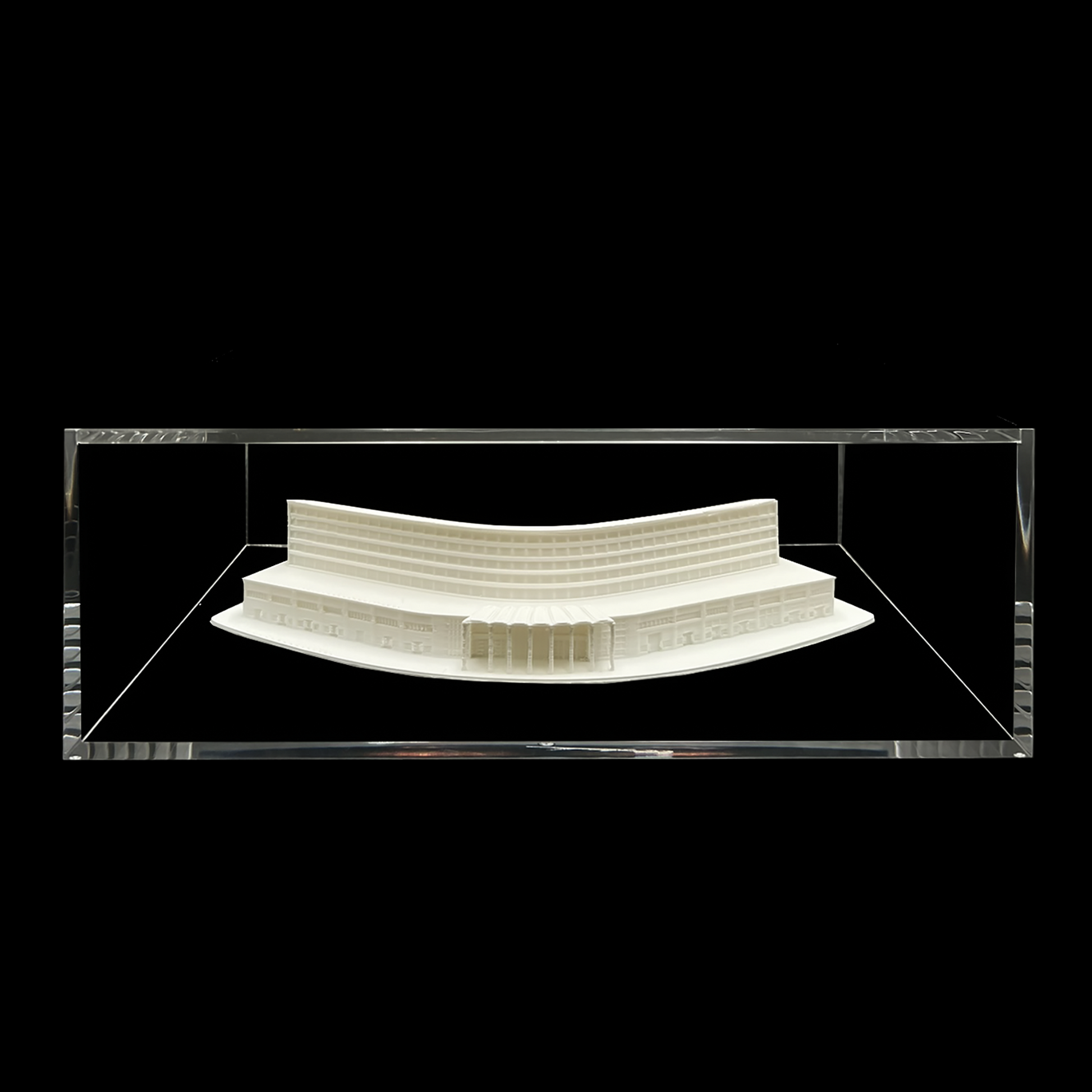 Moldada em resina ecológica de tom natural, a miniatura capta com precisão os traços geométricos e a elegância do edifício original.